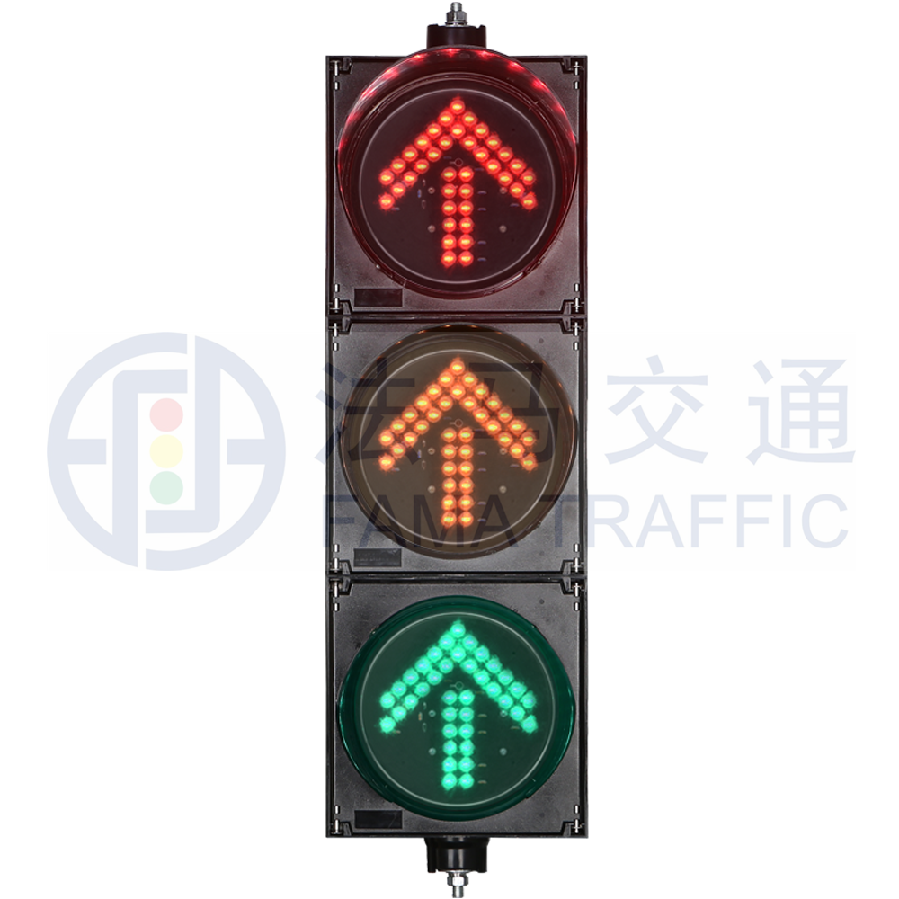 由紅色、黃色、綠色3個幾何位置分立的內有同向箭頭圖案的圓形單元組成,用于指揮某一方向機動車通行。箭頭方向向左、向上、向右和掉頭分別代表左轉、直行、右轉和掉頭。針對特殊情況下的多方向組合控制需求,可考慮將方向指示燈根據實際需求進行組合應用,如直左、直右信號燈,信號燈的使用須與地面交通標線相匹配。