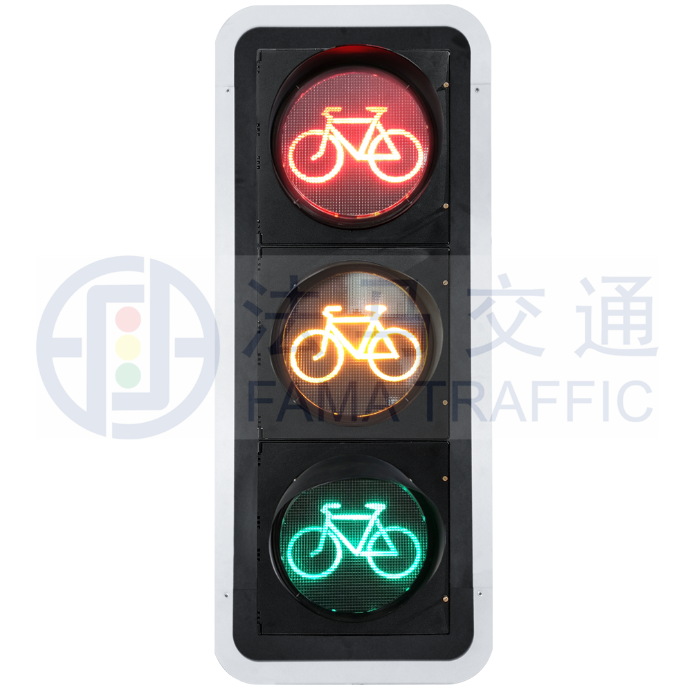 由紅色、黃色、綠色3個幾何位置分立的內有自行車圖案的圓形單元組成,用于指揮非機動車通行,紅燈表示禁止通行,綠燈表示準許通行,黃燈表示警示。