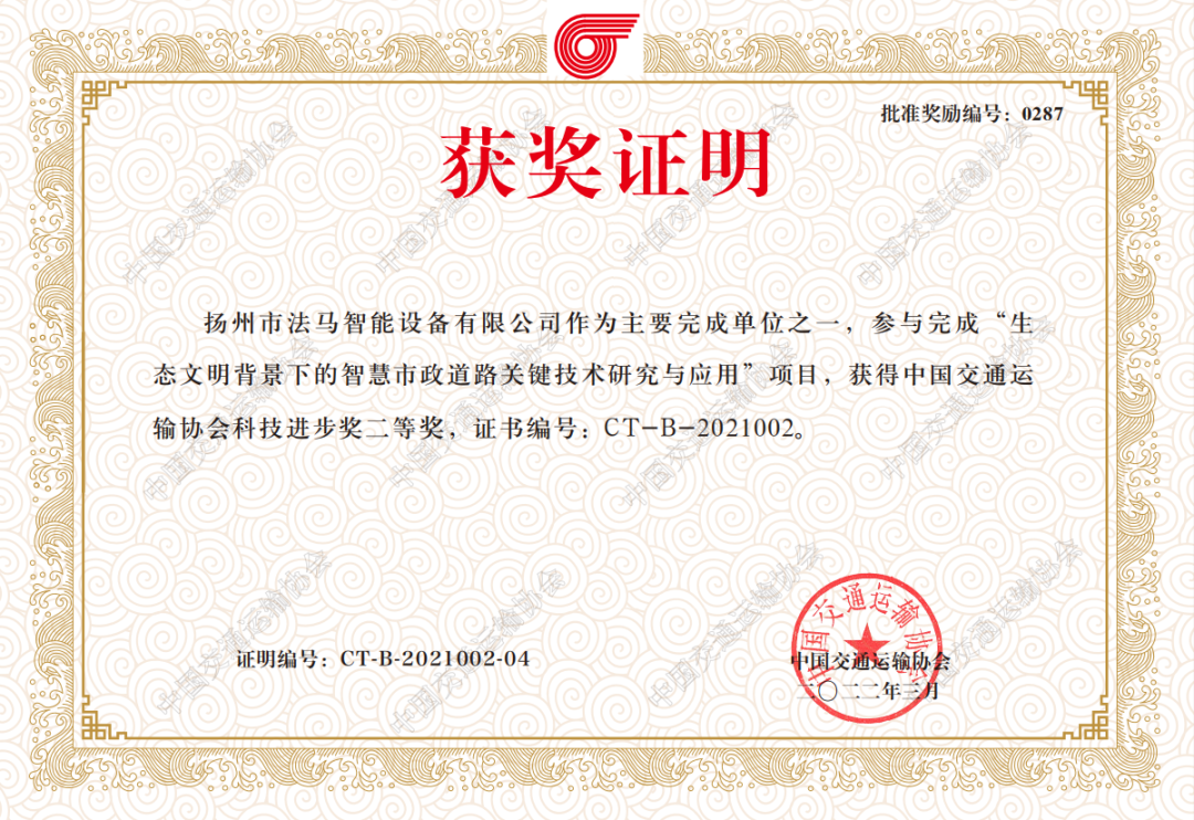 3月:榮獲中國交通運輸協會頒發的"中國交通運輸協會科技進步獎二等獎”;